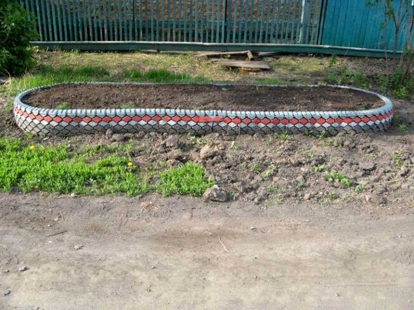 Срезается боковая часть шины, оставляется только протектор. Полученные полосы скрепляются между собой. Укладываются на землю в любую форму и заполняются землёй.