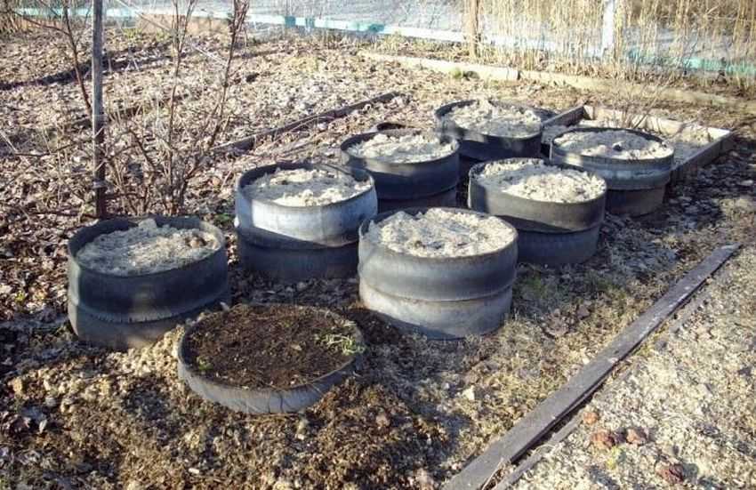 Удобно использовать несколько шин, поставленных одна на другую. В них можно заложить компост, а весной менять уровни местами.