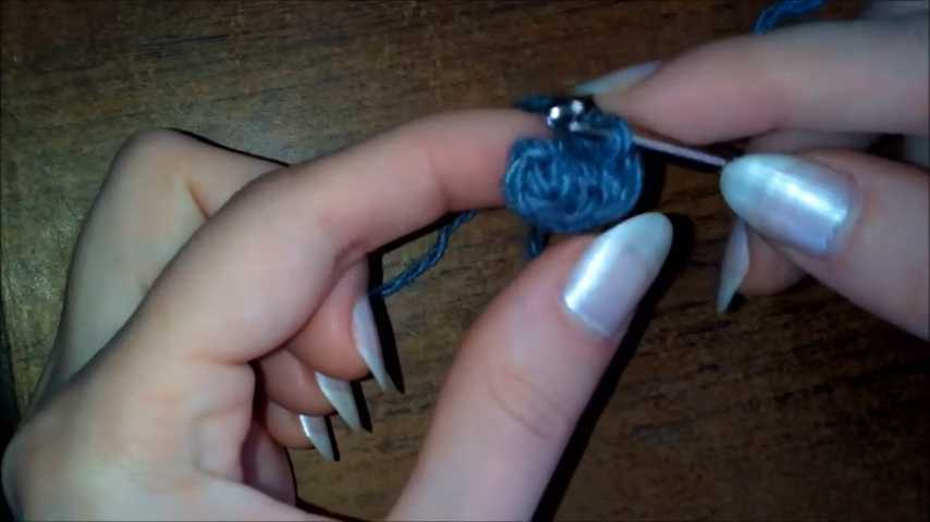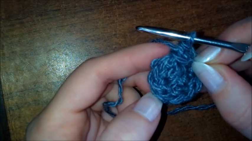 Изначально создается цепочка, состоящая из пяти воздушных стежков, которые соединяются в колечко. После этого выполняется еще три воздушных элемента и формируется кольцо уже из семнадцати столбов с двумя накидами.
