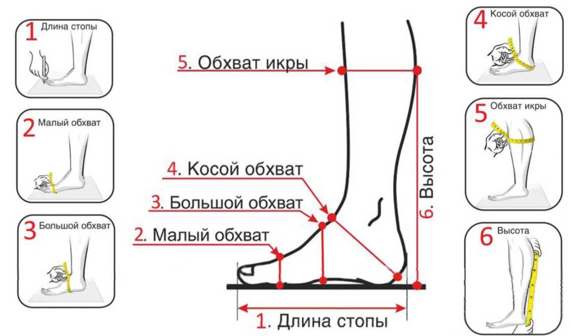 - подъем (ОП) – под пяткой до сгиба по наклонной линии;