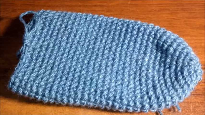Теперь отступаем 11 п. от шовчика и вяжем пяточку голубенькой нитью и с. без н. (всего – 22 с. без н.), поворачиваем и так в течение 12 р.. Затем нам нужно вывернуть и сшить, как показано на фото ниже.