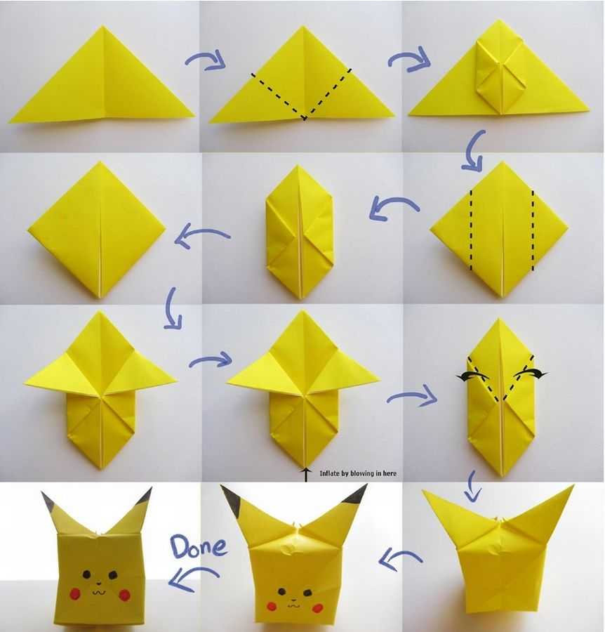 - модель переворачивают. Основание треугольника должно бить внизу. Нижние углы треугольника загибаются вниз. Работа выполняется по аналогии с технологией сгиба верхних конечностей. Получатся нижние лапки;
