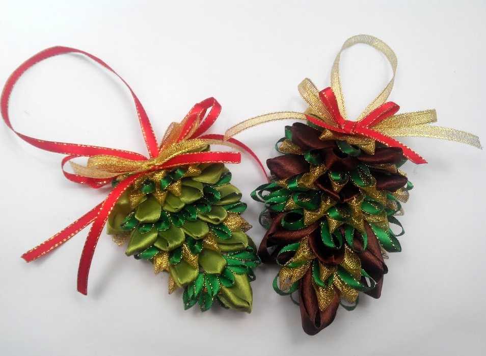 Для создания такой поделки потребуются разноцветные ленточки. Новогодние украшения из атласных ленточных полос послужат отличным подарком. Делать игрушки в такой технике одно удовольствие.
