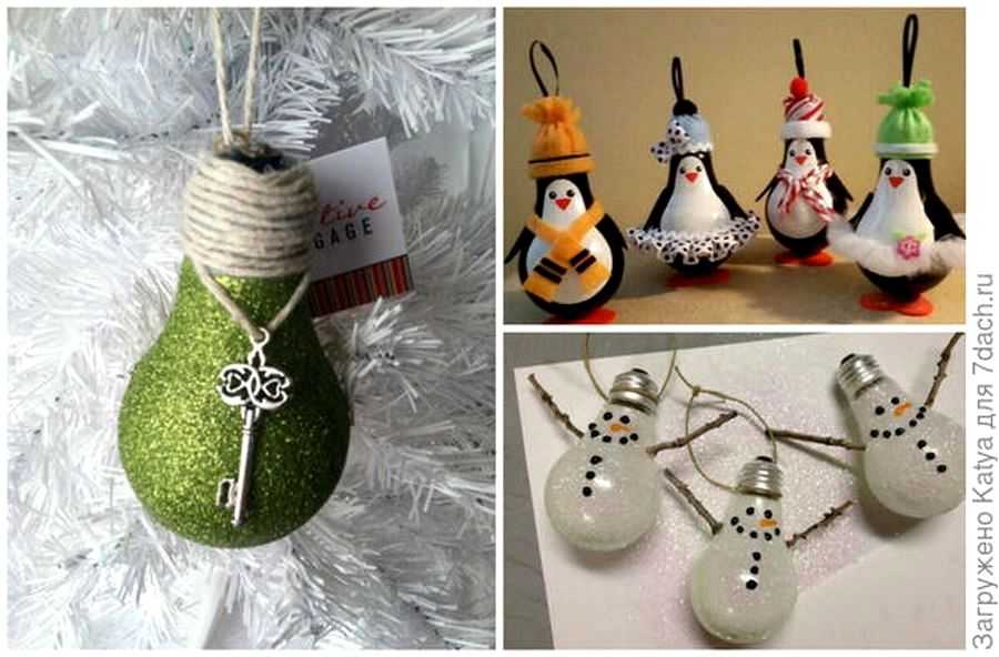 Из стеклянных лампочек получаются интересные разные фигурки, в первую очередь снеговики и пингвины, могут быть и другие персонажи, форма лампочек бывает разной.