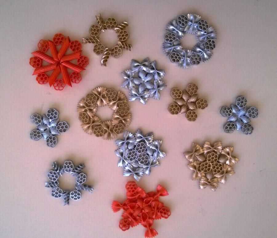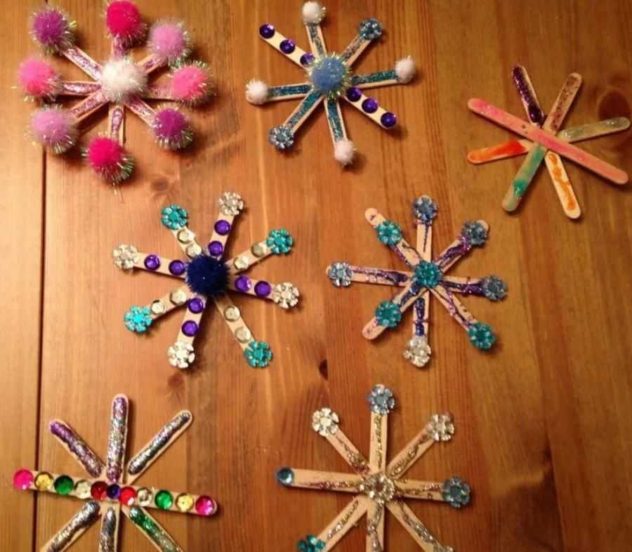 Елочные игрушки из палочек от мороженого. Палочки обрезаются и склеиваются термоклеем.