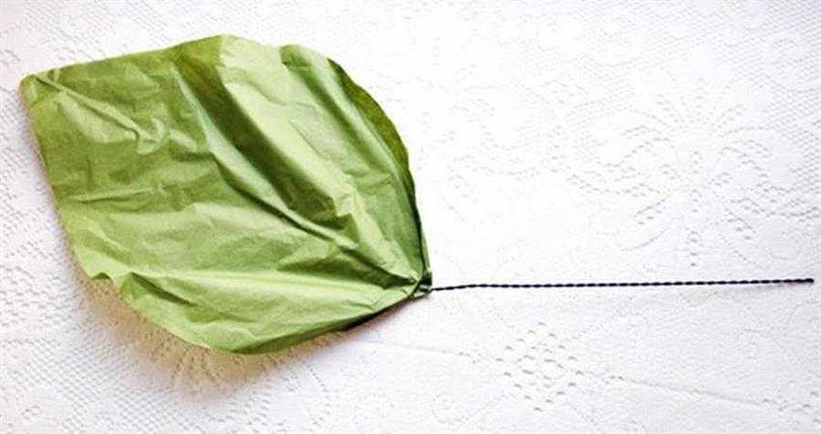 Сделайте проволочный каркас листа и обтяните его зелёной бумагой. Оставшийся конец листа примотайте к стеблю. Место соединения закройте цветной бумагой.