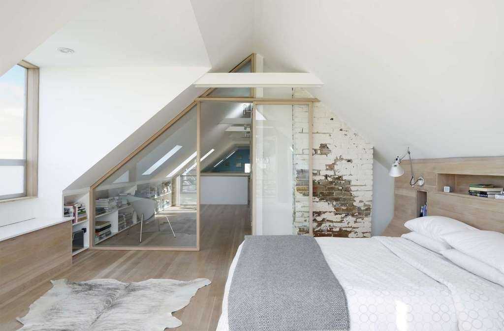 В мансарде спальня с гардеробной – одновременно очень практичный выбор, благодаря которому в комнате можно полноценно жить. Красиво смотрятся на фото спальня и гардеробная на чердаке под откосом.