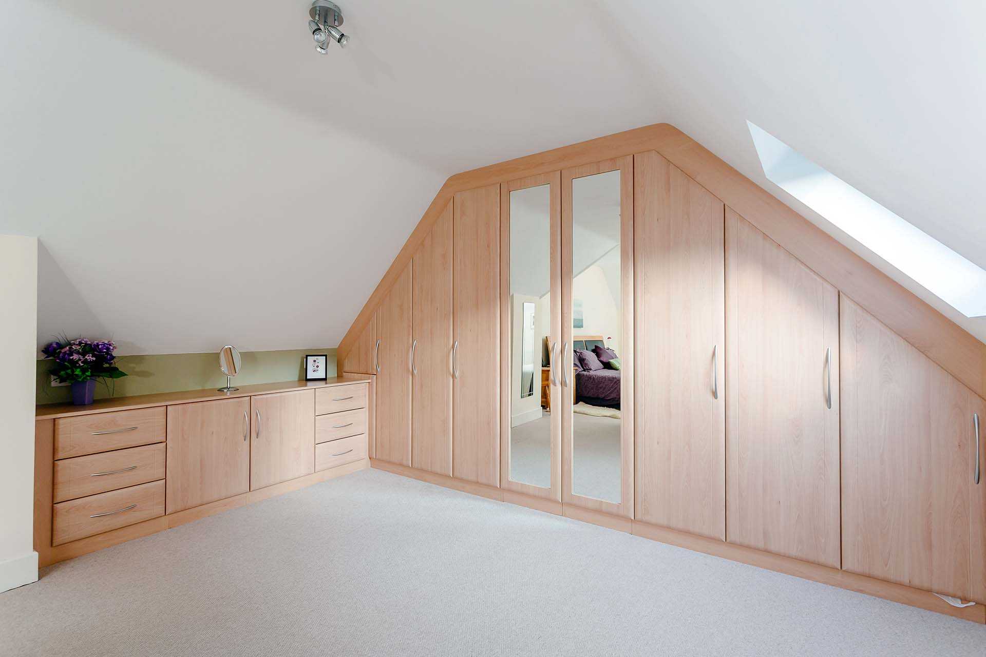 Шкафы для обычных квартир в этом случае не подойдут. Лучшим вариантом для решения этой проблемы будет установка встроенных шкафов во фронтонах.