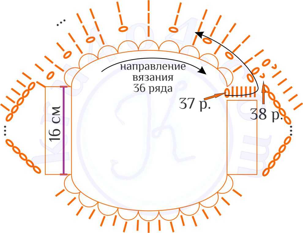 На схеме ниже, ещё раз указан 37 ряд, как он переходит в круговое вязание ручек авоськи.