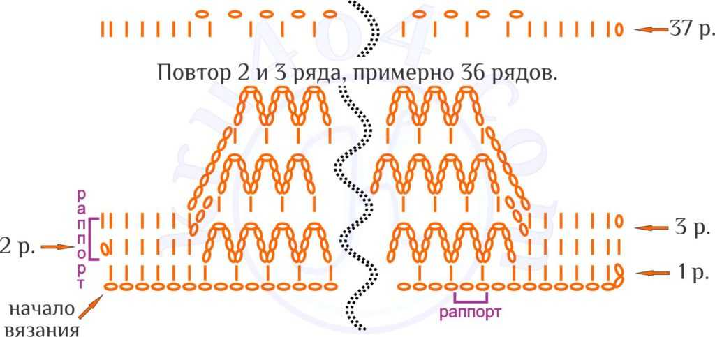 Повторяем 2-ой и 3-ий ряды. Вяжем примерно 36 рядов.