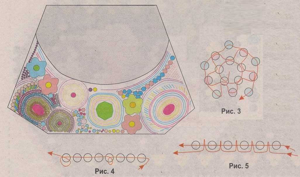 На схемах, которые представлены в статье, изображены выкройки лицевой и задней части сумки, а также верхнего сектора. Благодаря этим рисункам, вы можете сориентироваться, в каком направлении будут пришиваться камни. Есть одно небольшое правило, которое опытные рукодельницы постоянно соблюдают – это размещение крупных камней по центру вышивки, так как они задают весь внешний вид изделия. Оставшиеся пустоты оформляются всевозможными бусинами и бисеринами. Не старайтесь вышить сумку сразу десятью разными цветами. Пусть это будет три или четыре основных цвета. В противном случае, ваше рукоделие будет смотреться слишком перегруженным в цветовой гамме.