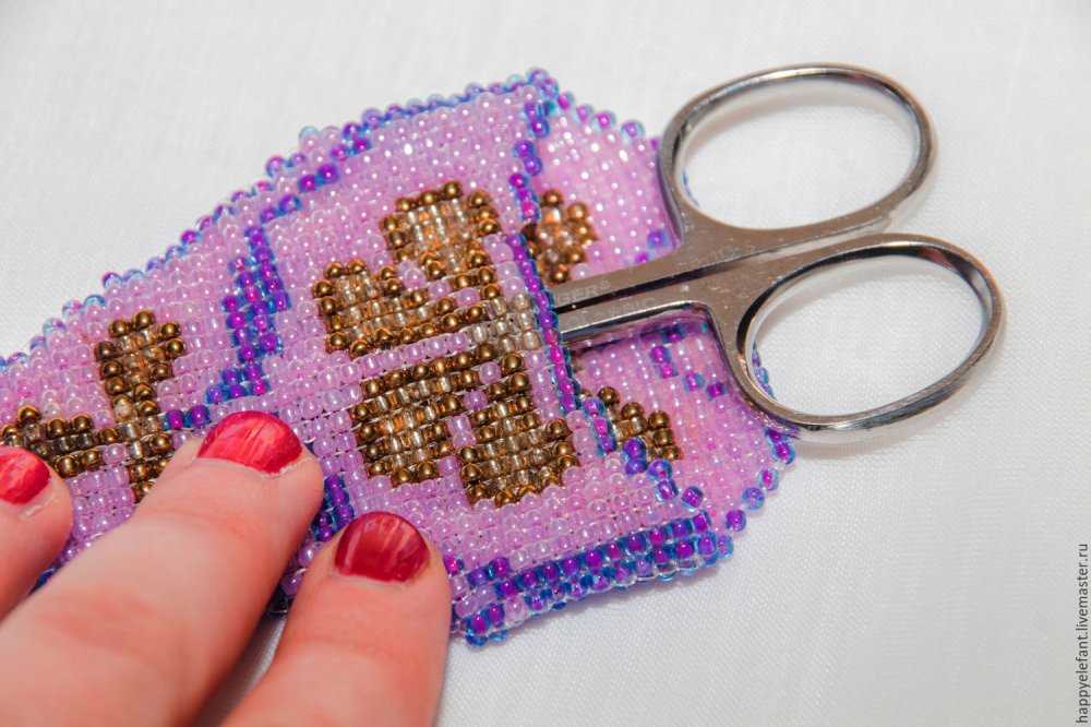 Для поклонников изделий из бисера предлагаем схему такого чехла для ножниц.