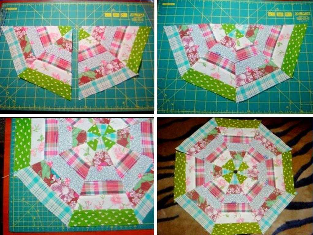 - Сборка изделия. Сначала сшивают маленькие фрагменты, затем соединяют их по схеме. Пришивают подкладку, утюжат.