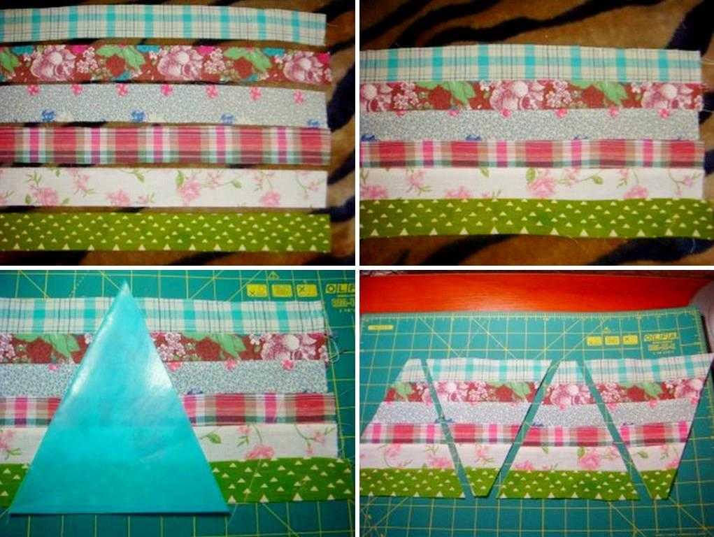 - Детали сшивать попарно и заутюживать. Стежка машинная. Получится 4 сшитых треугольника.