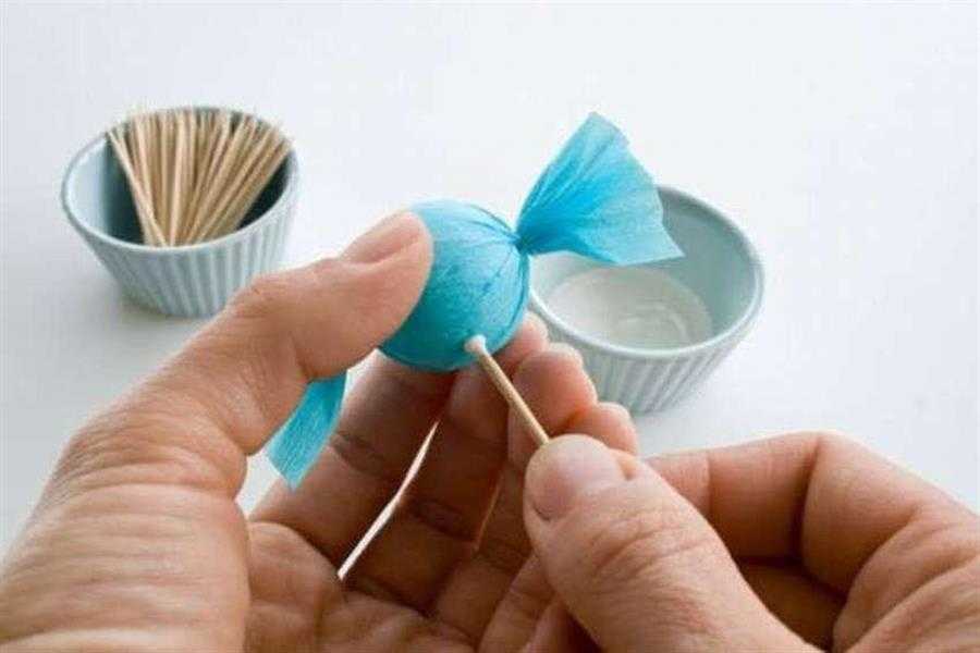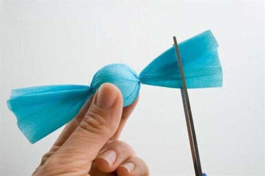 - Края «конфеты» следует завернуть «хвостиками». После того, как вы их скрутите, зафиксируйте «хвостики» лентой или серпантином, завязав бантик, либо же узелок.