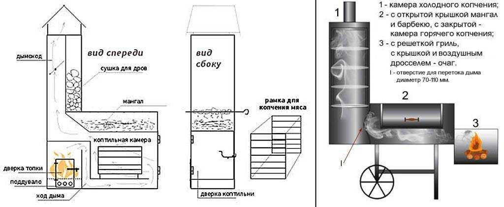 - Коптильная камера. Для горячего копчения выполняется из металла или кирпича, для холодной обработки допускается изготовление из досок или фанеры.