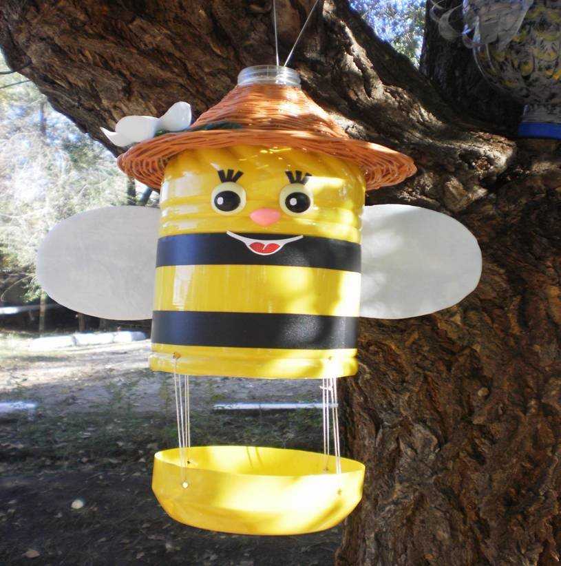 Вот еще кормушка на пчелиную тематику: старый веник, раскрашенная бутылка из пластика и немного игрушечных пчелок. Зимний сад сразу заиграет другими красками.