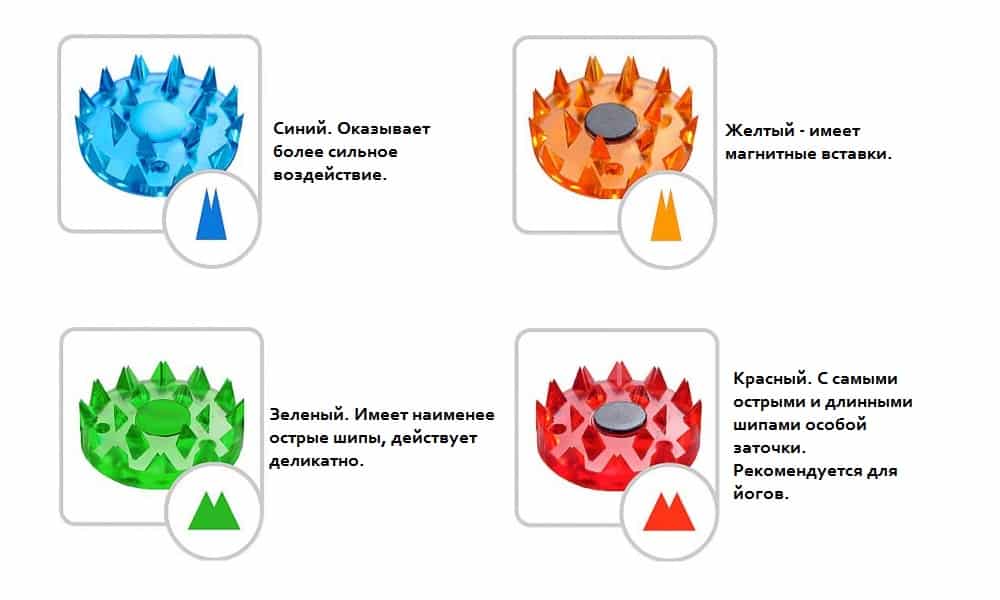 - Жёлтый – острота иголок аналогична синему варианту, но в дополнении к этому присутствует магнитная вставка, усиливающая эффект от воздействия аппликатора;