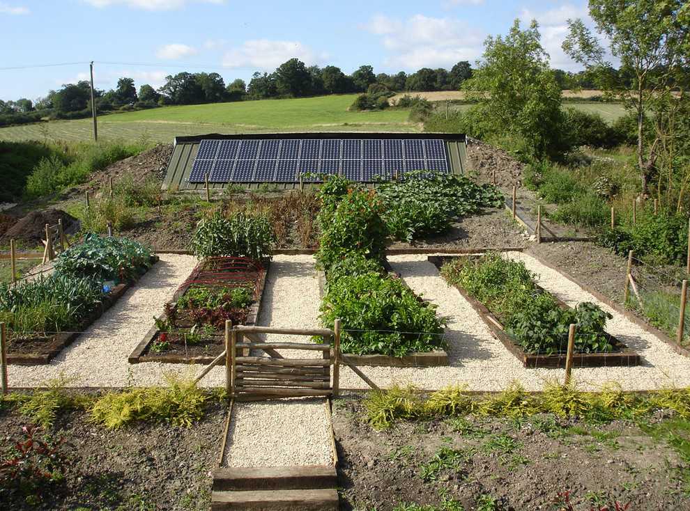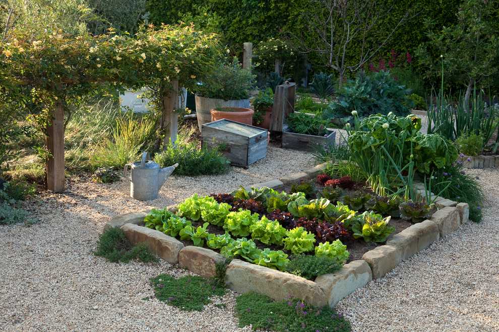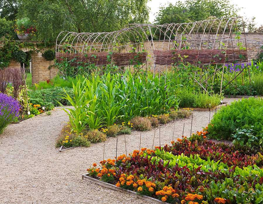 Вместе с овощами можно посадить цветы, которые красиво дополнят овощные культуры. Дорожки оформляются гравием, плиткой, камнем или газонной травой.