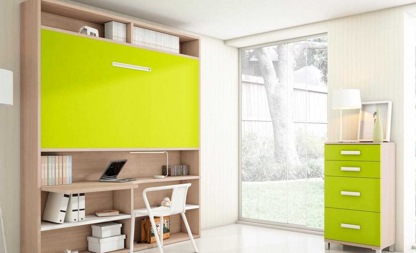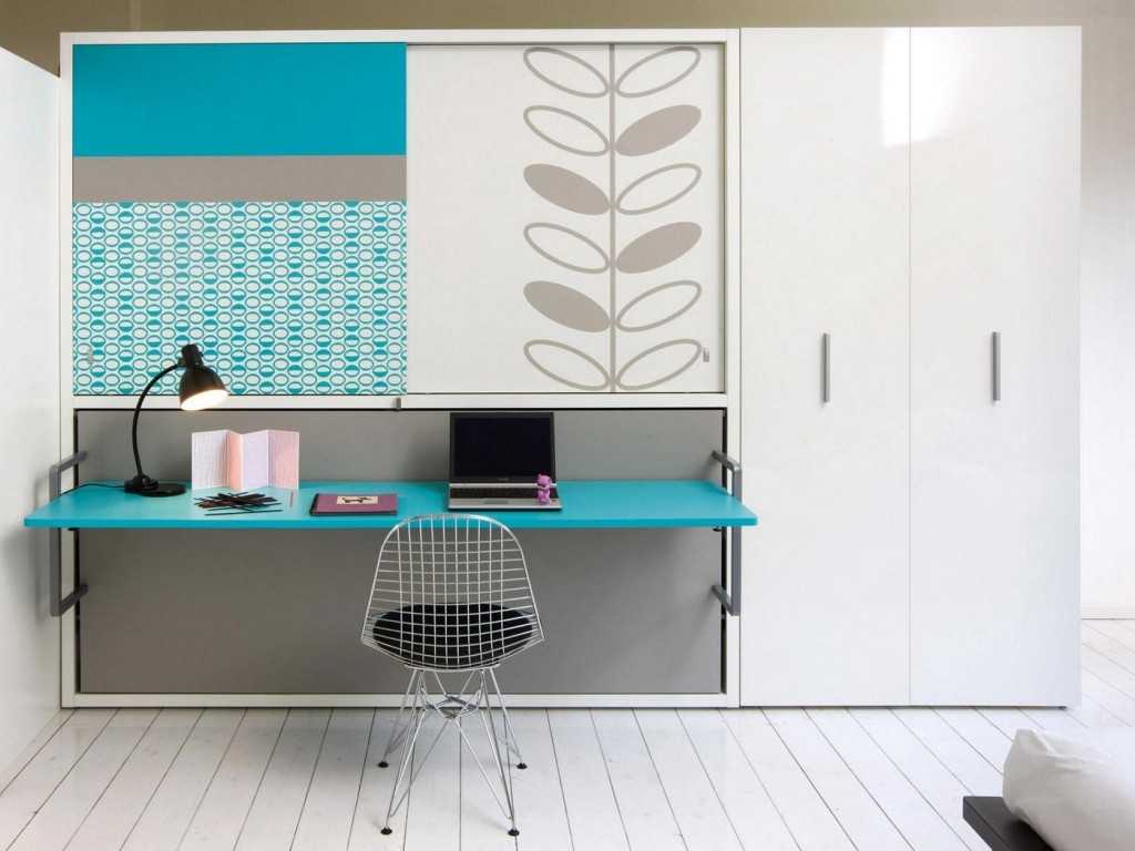 Откидная стол-кровать совмещает в себе место для сна, учебных занятий и систему хранения. Кровать и стол подвергаются преобразованию, а шкаф служит в качестве стационарной основы.