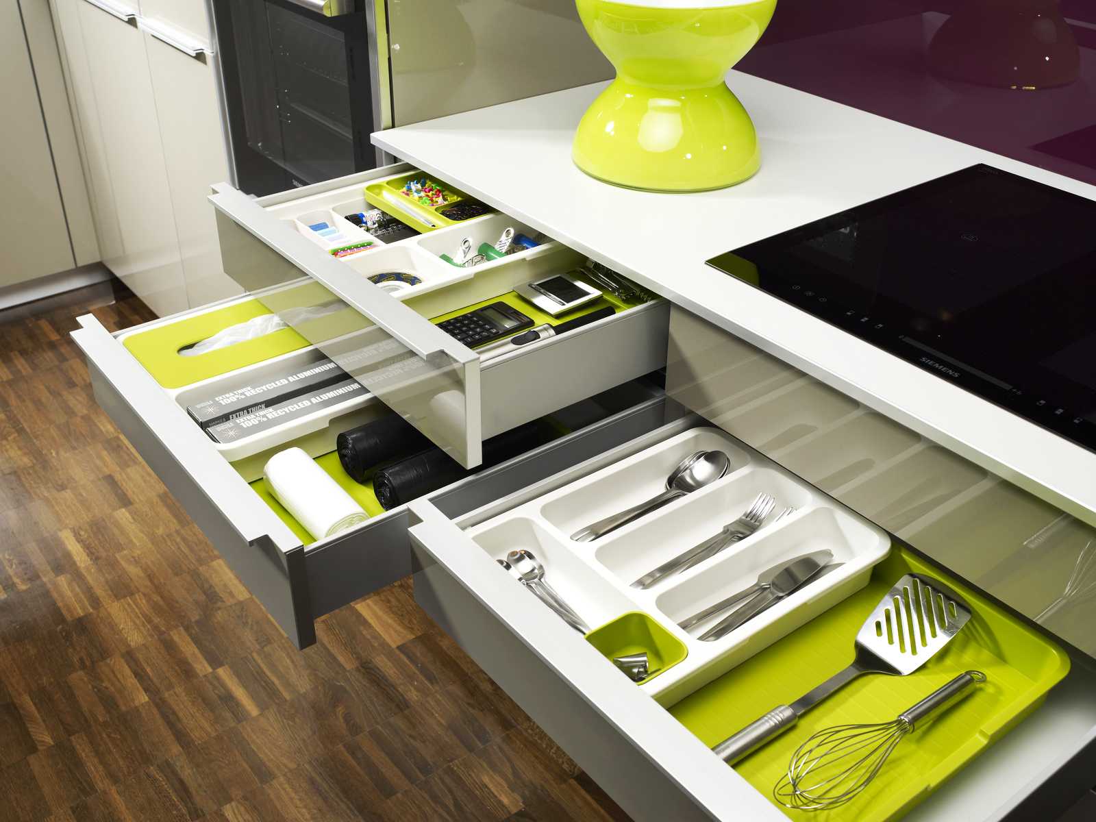 Если ваша кухня организована оптимально, то все предметы на ней будут иметь свое место, а все мелочи аккуратно расставятся по полочкам и ящикам. Согласитесь, такая организация – мечта любой хозяйки. Чтобы помочь ей в исполнении ежедневных рутинных обязанностей на кухне и превратить обычную готовку в увлекательный процесс, следует подойти к организации пространства на кухне с фантазией. Ведь согласитесь: когда вы поглощены творческим процессом приготовления пищи, нет времени искать, где лежат ложки, а где вилки. Поэтому целесообразно предусмотреть специальный лоток для столовых приборов. При этом можно выбрать вариант, который наиболее подходит вашему бюджету.