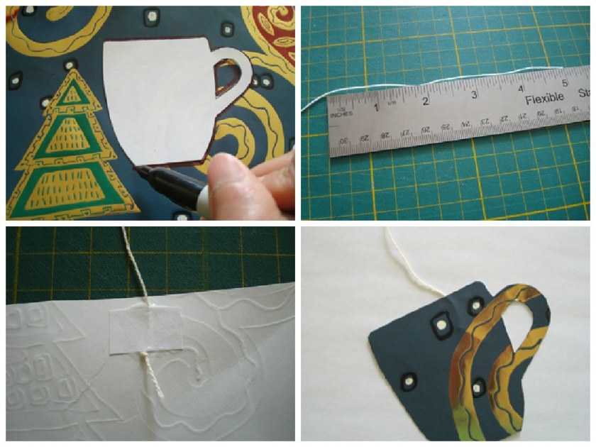 - Приклеить нить к любой стороне картона, как будто в чашку опущен чайный пакетик.