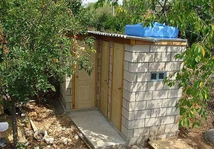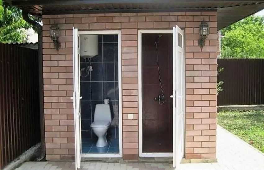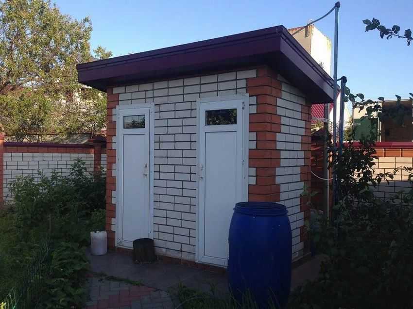 Летний душ и туалет из кирпича под одной крышей. 10 фото