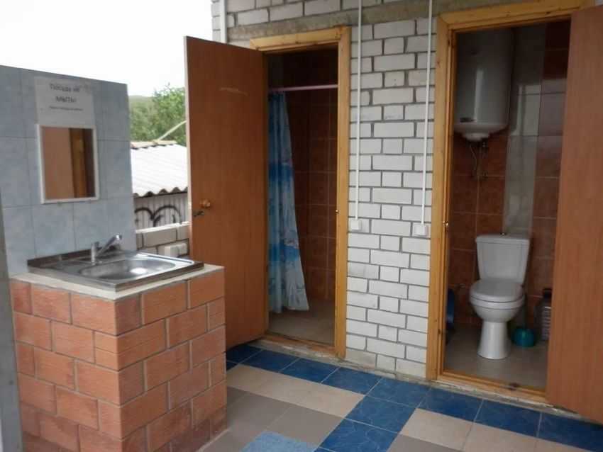 Душ и туалет из кирпича под одной крышей, удобства с комфортом на природе.