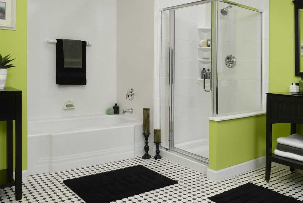 Хорошо смотрится сочетание белой кабинки и ярких акцентов