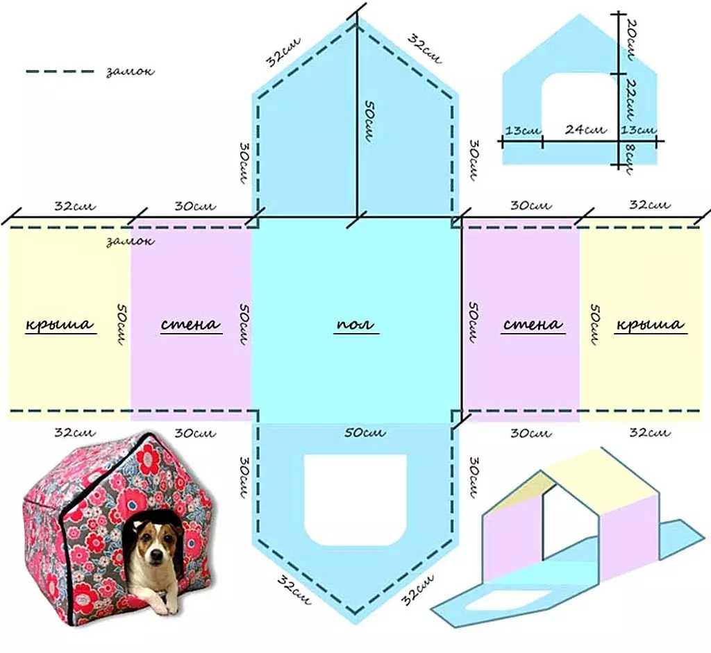 лежанка для собаки в виде домика — такая конструкция будет оптимальным вариантом для мелких собак, но более сложной в исполнении. Выкройка деталей домика (пола, потолка, крыши и боковых стен) делается из целого листа бумаги, а задняя и передняя стенка со входом конструируются отдельно. Каркасом для этого вида лежанки может служить обычный картон.