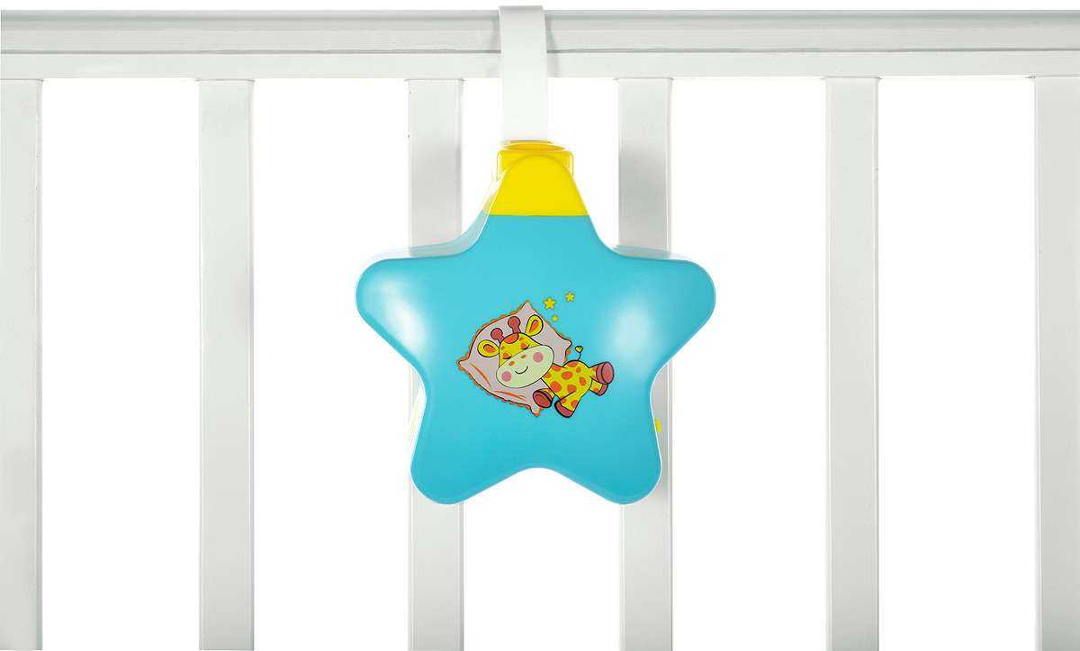 Данный ночник-проектор изготовлен в форме небольшой звездочки и имеет 3 рабочих режима. Устройство обладает возможностью играть мелодию без свечения, работать в качестве ночника и одновременно воспроизводить мелодии с подсветкой. Проектор отображает на потолке разных животных, которые двигаются по кругу. Плавное передвижение персонажей помогает быстрее заснуть ребенку. Конструкция предусматривает управление громкостью с помощью переключателя, находящимся сбоку корпуса.