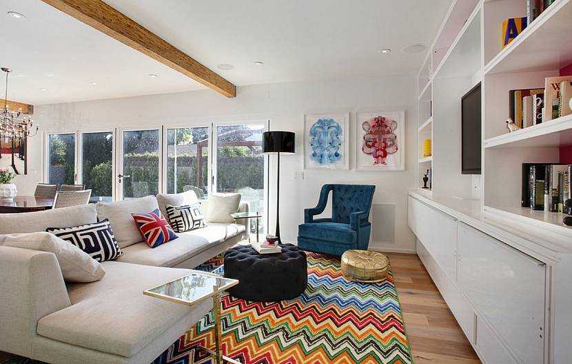 Диван с боковыми нишами для полок прекрасно подойдет для зонирования гостиной.