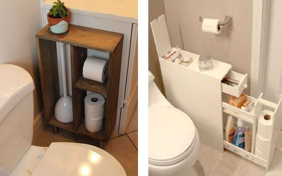 Если позволяет простенок между стеной и унитазом, можно встроить в него такую невысокую тумбу.