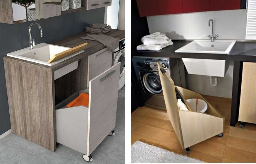 Для крупногабаритных предметов (тазиков, ведер, корзин для белья) можно предусмотреть более объемные места хранения.