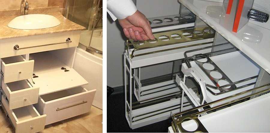 Наполнение тумб в ванную комнату может быть разным, как и кухни. Можно использовать полки и выдвижные ящики, бутылочницы и сетчатые системы хранения.
