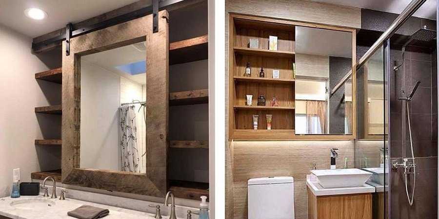 Также традиционное зеркало над умывальником может стать дополнительным местом хранения. Если разместить его на створке плоского шкафчика. Причем створка может быть не распашной. А, например, купейной или откидной.