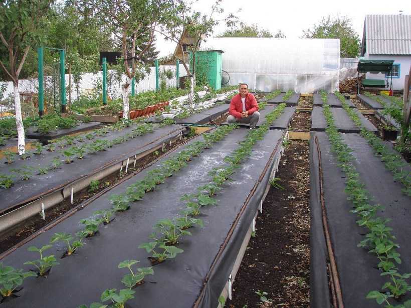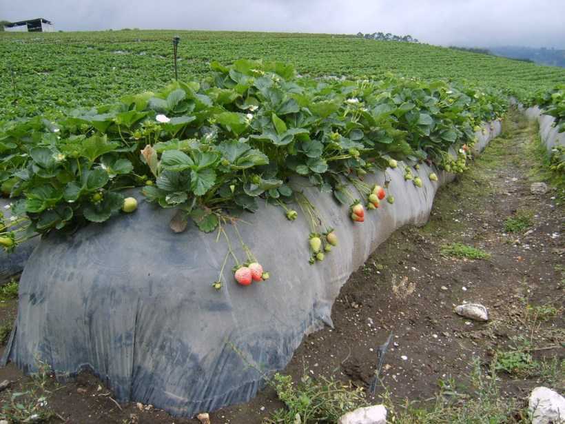 За счет применения мульчирующей пленки, либо агроволокна черного цвета, облегчается процесс ухода за клубникой. Укрывной материал неорганического происхождения также обладает рядом преимуществ: