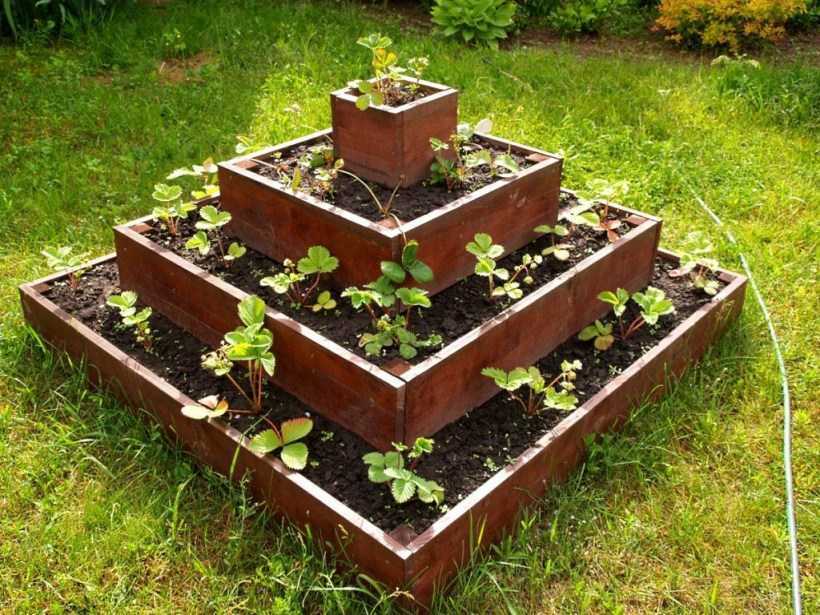 Пирамида для выращивания клубники представляет собой конструкцию из коробов разного размера, установленные друг на друга по мере возрастания. Смещение ярусов по размеру образует ступеньки, создающие ниши. Емкости заполнены почвой, куда и высаживают растения. Самыми маленькими делают двухъярусные грядки для клубники, но по желанию их можно увеличить до 3, 4, 5 и даже больше. Главное, чтобы высота пирамиды позволяла свободно обслуживать верхний ярус.