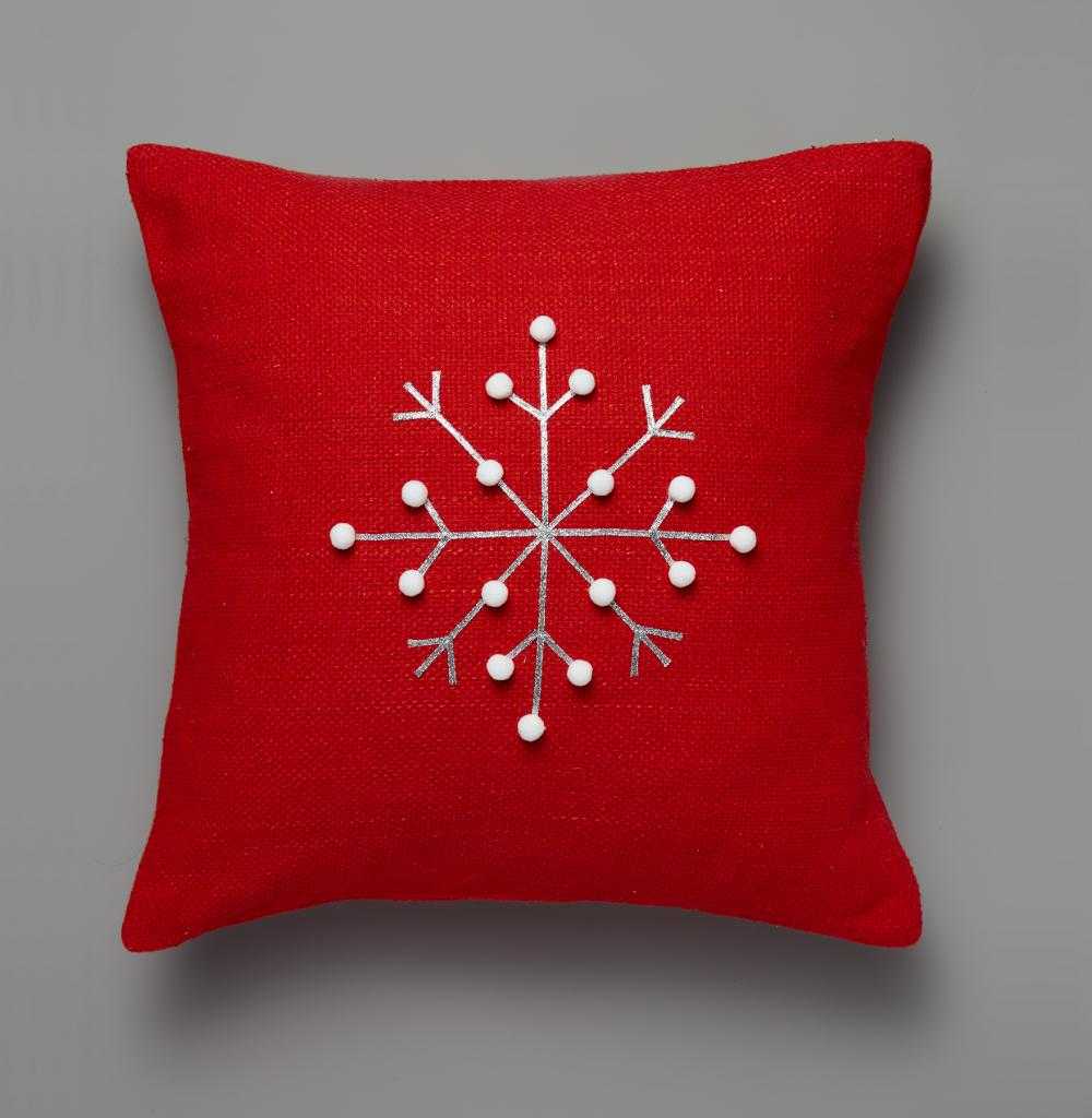 Один из самых простых вариантов декора – это снежинка, прикрепленная к диванной подушке. Она внесет дополнительный праздничный штрих и уют в интерьер дома. Вам понадобится обычная наволочка красного цвета (или любая однотонная). Кроме того, нужно взять серебристую капроновую ленту и несколько белых помпонов.