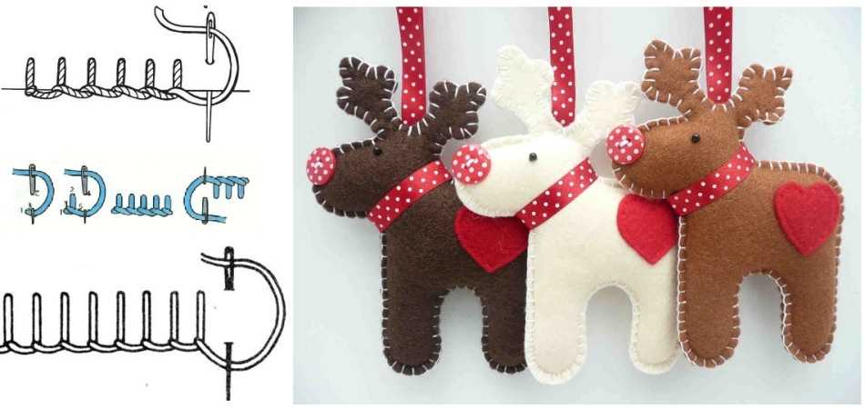 Далее, вырежьте заготовки из фетра, и сшейте игрушки с помощью сметочного или петельного шва. Не забудьте прикрепить петельку из ленты.