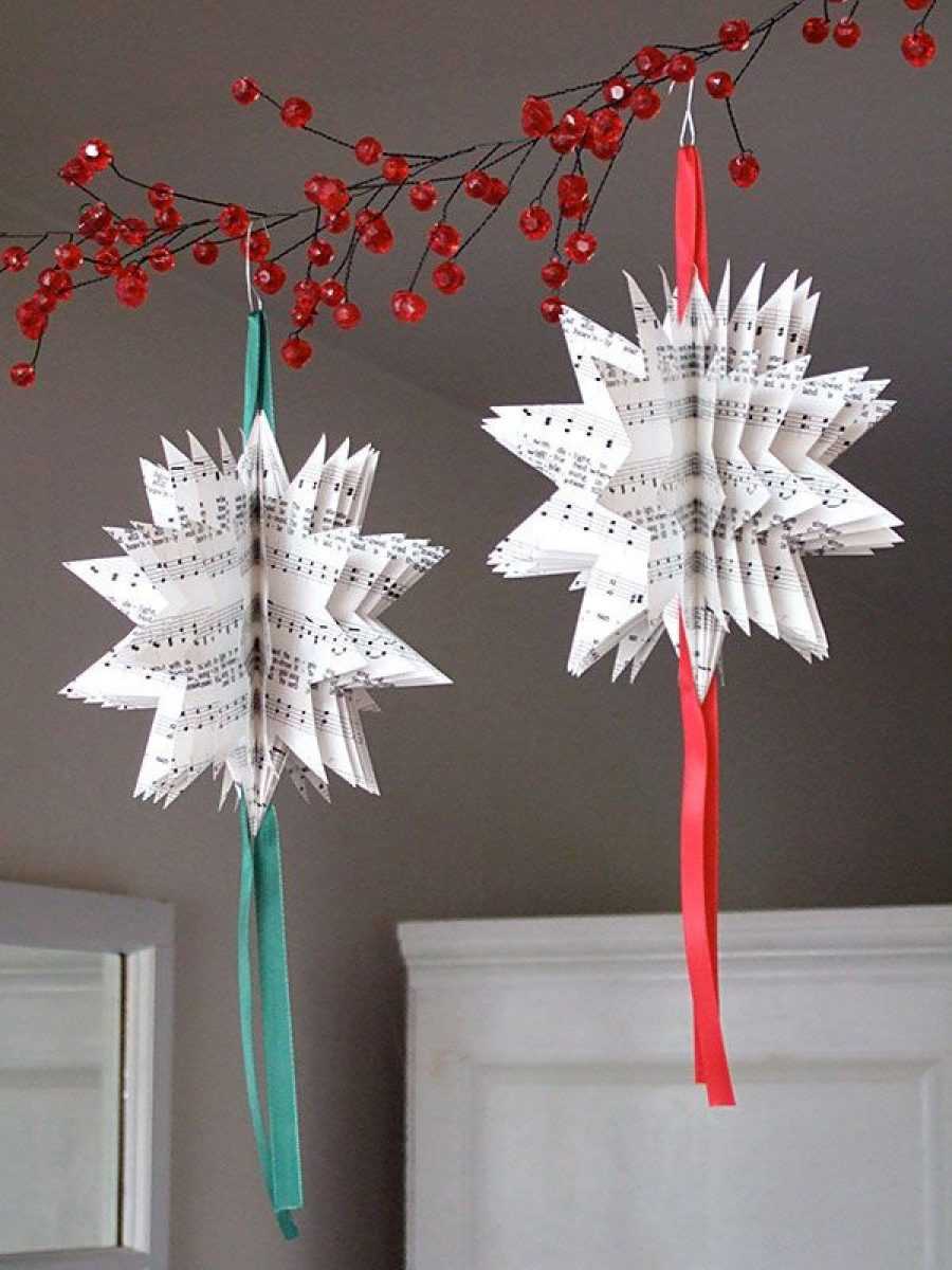 Проще всего делать новогодние украшения из бумаги. Из нее делают плоские игрушки, снежинки, гирлянды. Для их изготовления потребуется приобрести только набор цветной бумаги и клей.