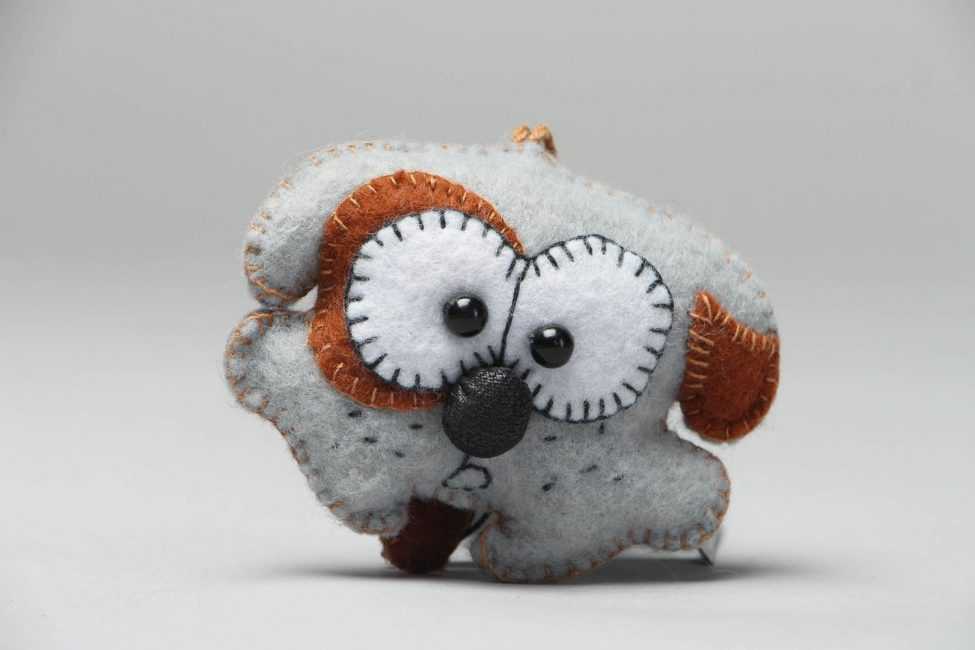 Дополнительно вырежьте из фетра мелкие детали ― глазки, носики и др. Их желательно приклеить к игрушке с помощью клея. Чтобы игрушки были привлекательными, украсьте их бисером, блестками, паетками. Вот такая красота у вас получится: