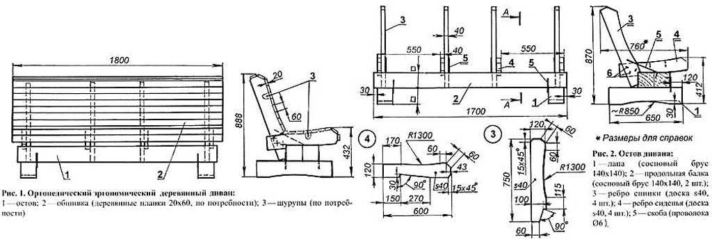 Чертежи садово-дачного дивана, подходящего под такие условия, приведены на рис. Конструкция его достаточно трудо- и материалоемка, но технологически не сложна: деталей, конфигурация которых требовала бы применения лекал или шаблонов, в ней нет. Существенный ее недостаток – большой отход дорогого бруса, 1,3 м с 6-метровой заготовки, а 3-метровой мало. Садовая скамья-диван на след. рис. проще и толстый брус для нее не нужен, но 4 детали нужно выпиливать по сетке. Что, впрочем, при наличии электролобзика не страшно.