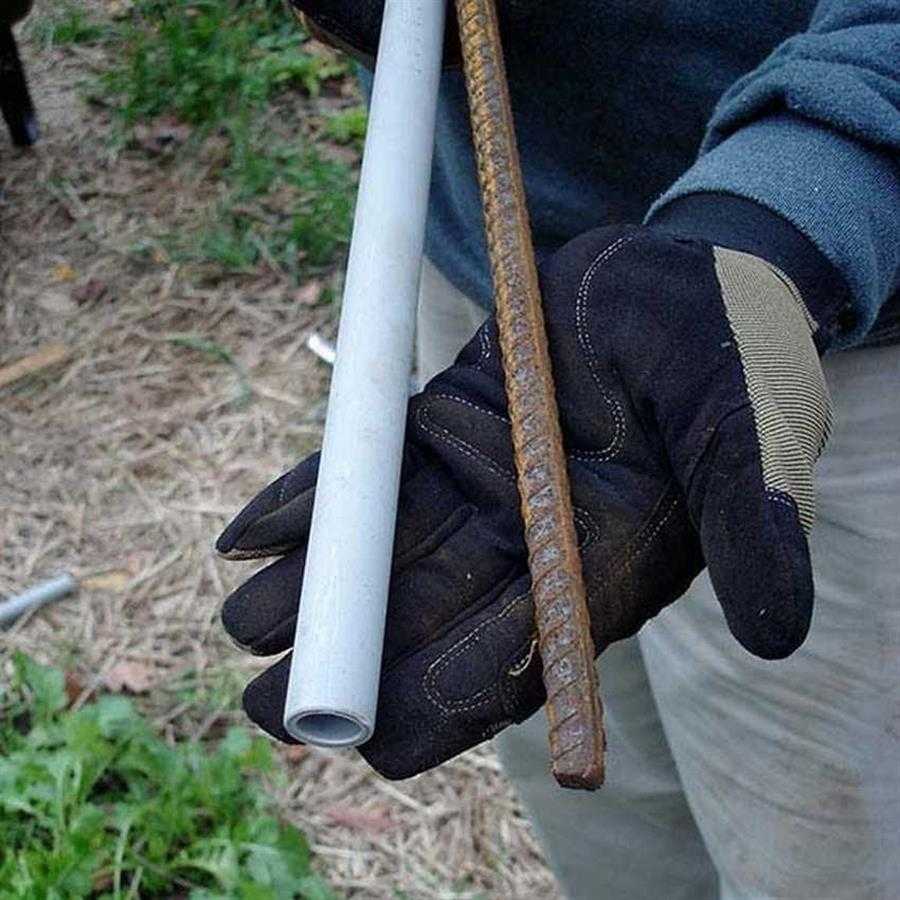 По обе стороны от грядки в землю забиваются куски арматуры: