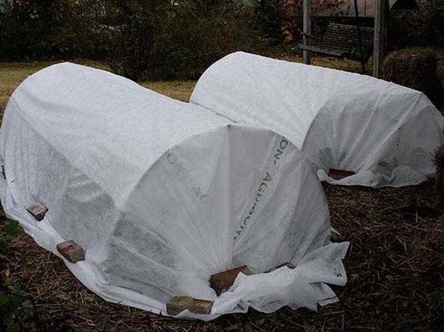 Весь каркас накрывается укрывным материалом и фиксируется тяжелыми предметами: