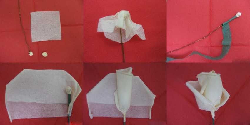 - Для оформления красного соцветия круглое салфеточное полотно нужно разрезать от края до центральной точки, затем свернуть деталь кулечком. Образовавшийся бутон требуется аккуратно расправить.