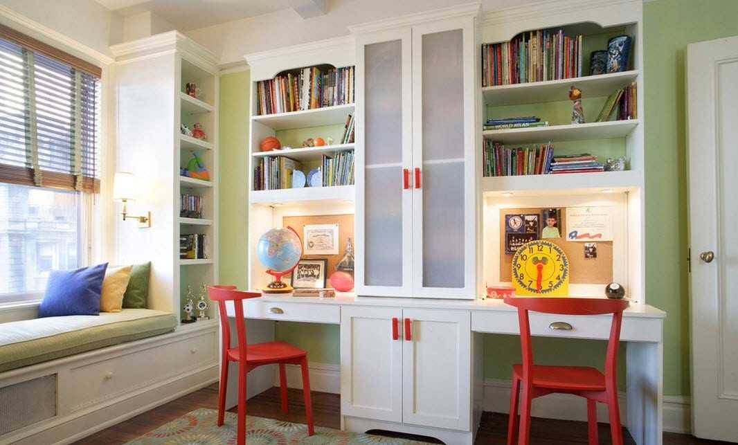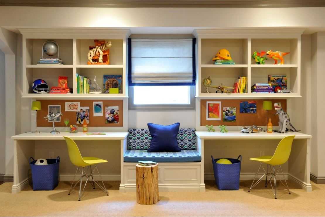 Если в комнате проживают два школьника, то у каждого из них обязательно должно быть отдельное рабочее место. В данной ситуации рассмотрим несколько вариантов для письменного стола: