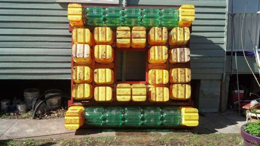 Комбинированный вариант канистр с бутылками, которые объединили в блоки. Не хватает разве что навеса от солнца.