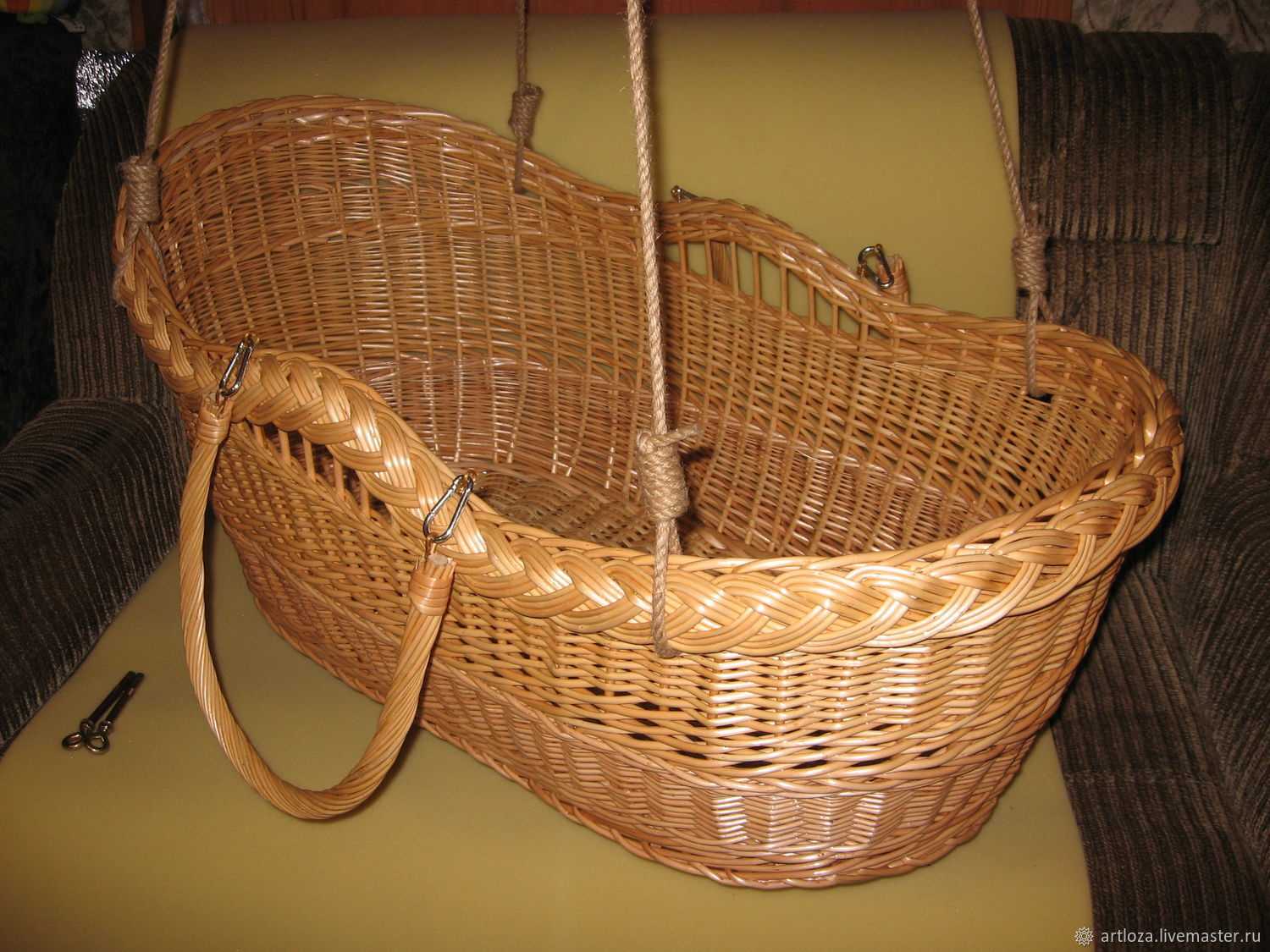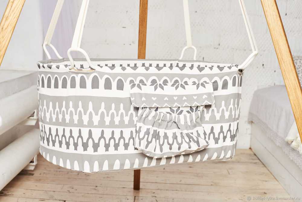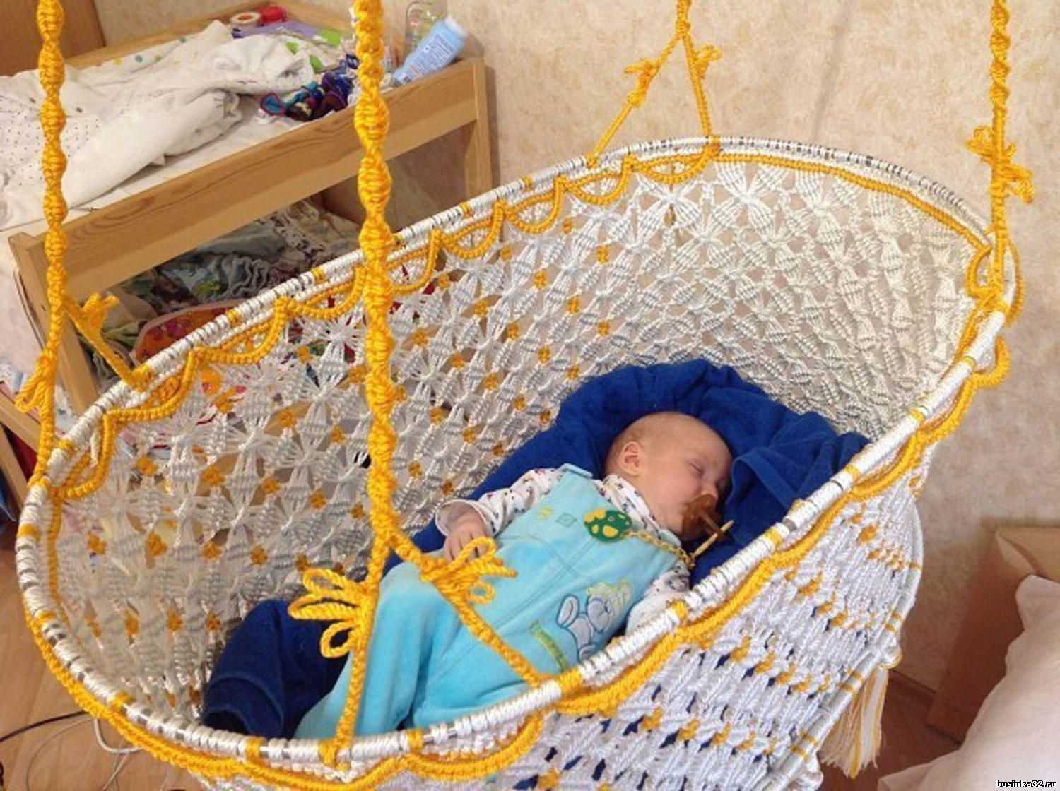 Материал для подвешивания также должен быть очень прочным, чтобы выдерживал вес люльки с ребенком, увеличенный как минимум в 20 раз. Ну а сама люлька должна иметь высокие борта, чтобы малыш не мог вывалиться из нее.