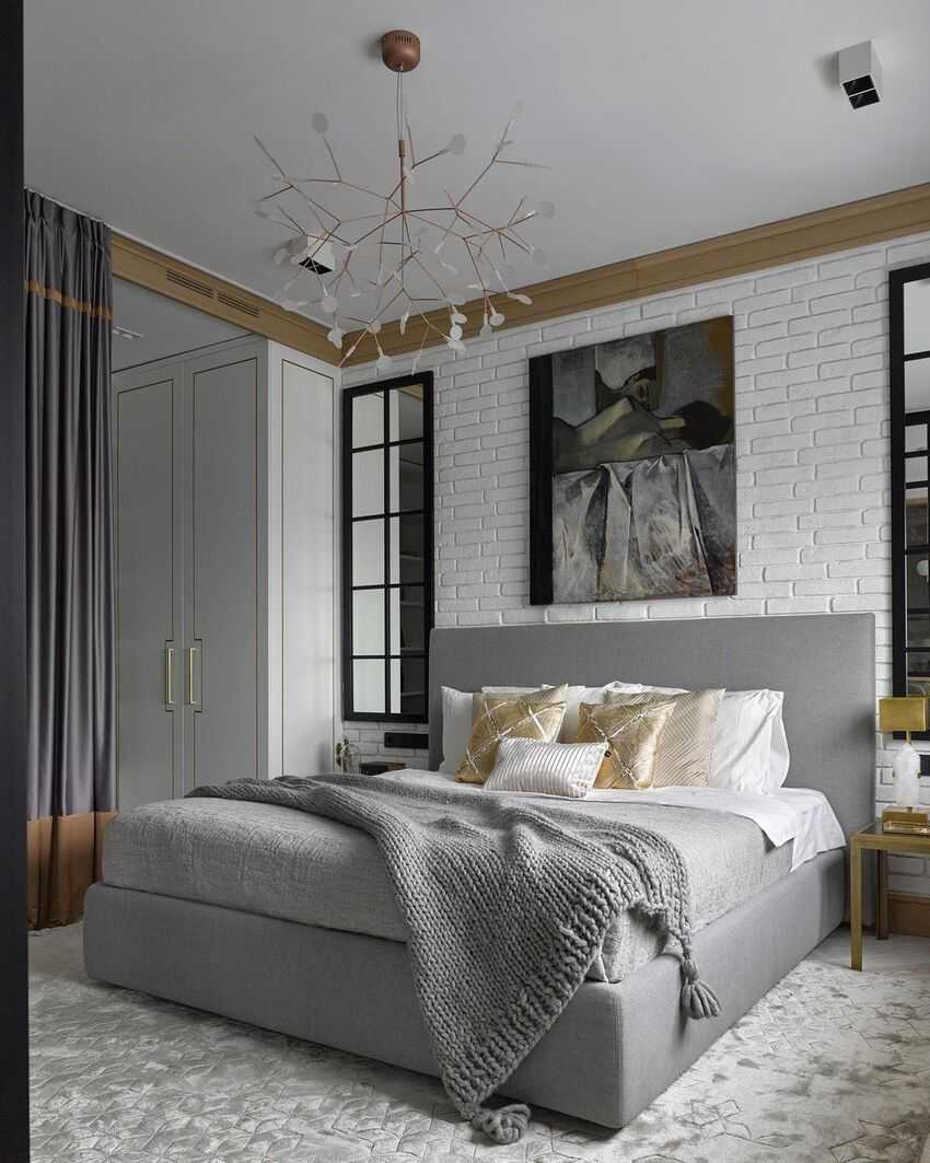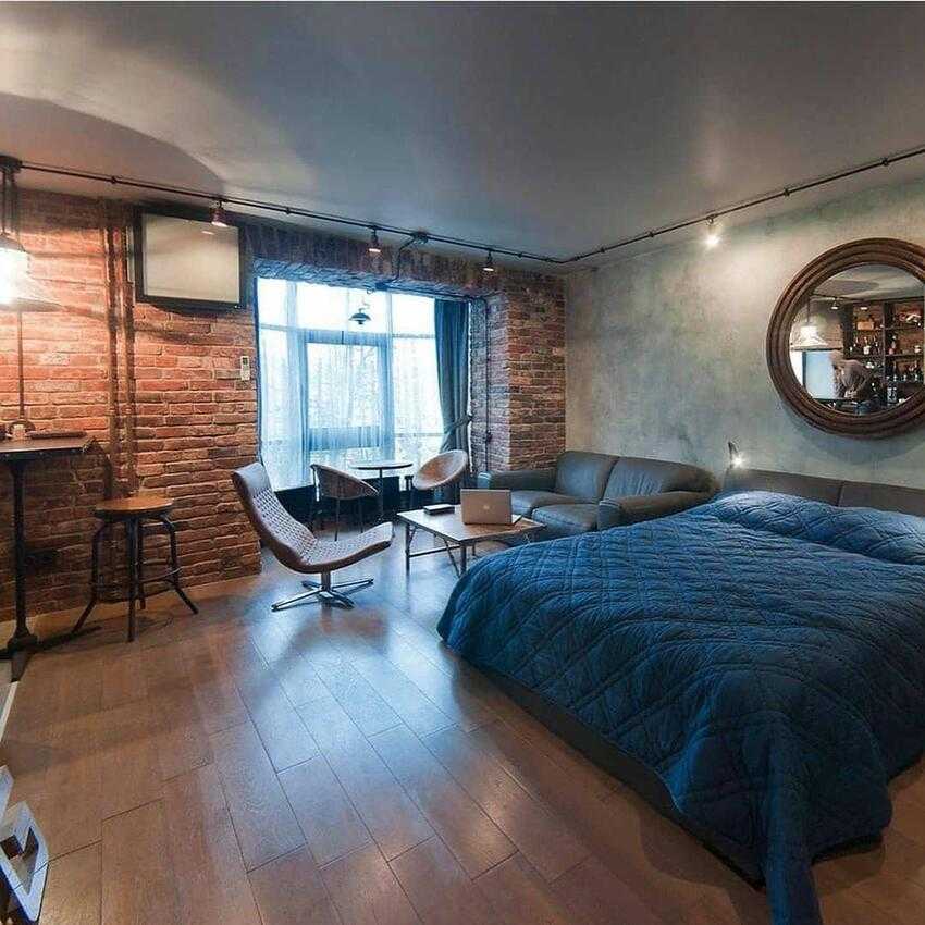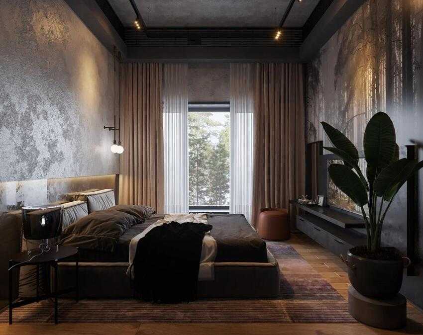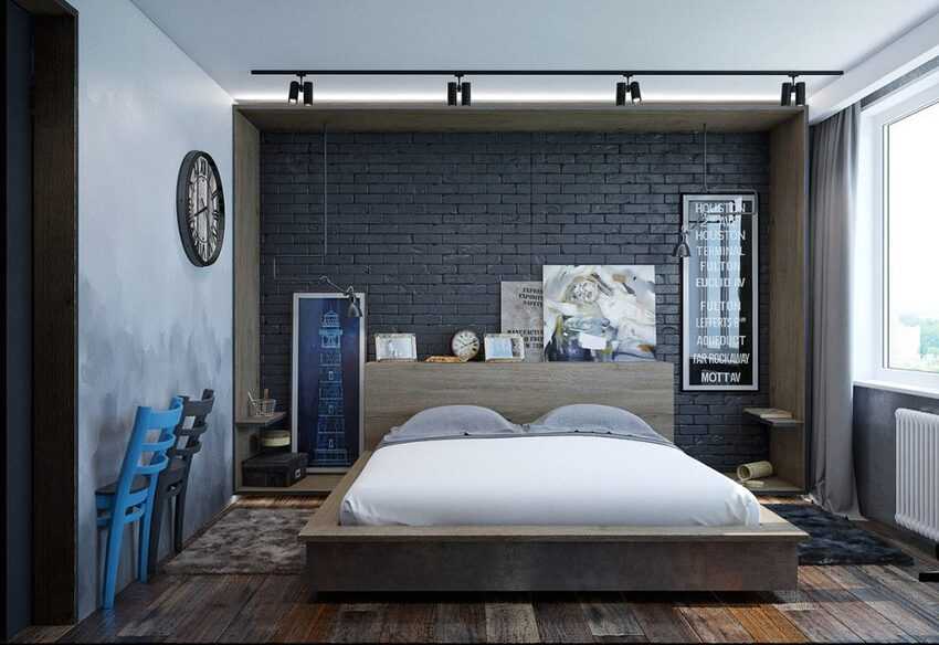 В спальне в стиле лофт важно сочетать практичность с удобством и функциональностью. Часто устанавливают только одну большую кровать по центру стены